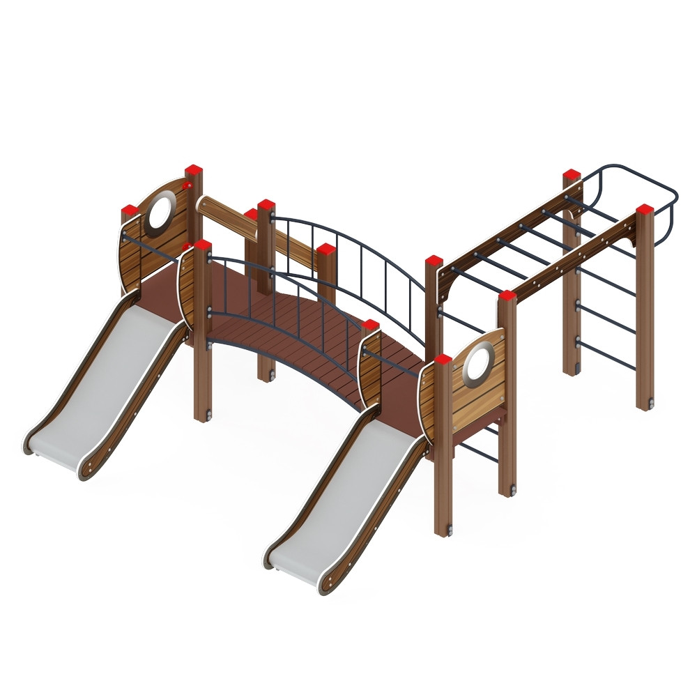 Детский игровой комплекс "Карапуз" ДИК 1.001.04-01 состоит из множества полезных и необходимых элементов для развлечения и развития детишек. Во-первых, это горки. Их здесь две штуки, что позволяет одновременно кататься двум малышам. В детских садах, это особенно актуально, так как на прогулке в группе множество детей, и многие из них захотят покататься на горке. Наличие двух горок в одном комплексе здорово помогает решить вопрос интенсивного использования горок - нет никаких очередей, дети взбираются на комплекс, выбирают свободную горку и скатываются. Рукоход, шведская стенка и турник образуют спортивный элемент комплекса, который помогает детям развиваться физически.